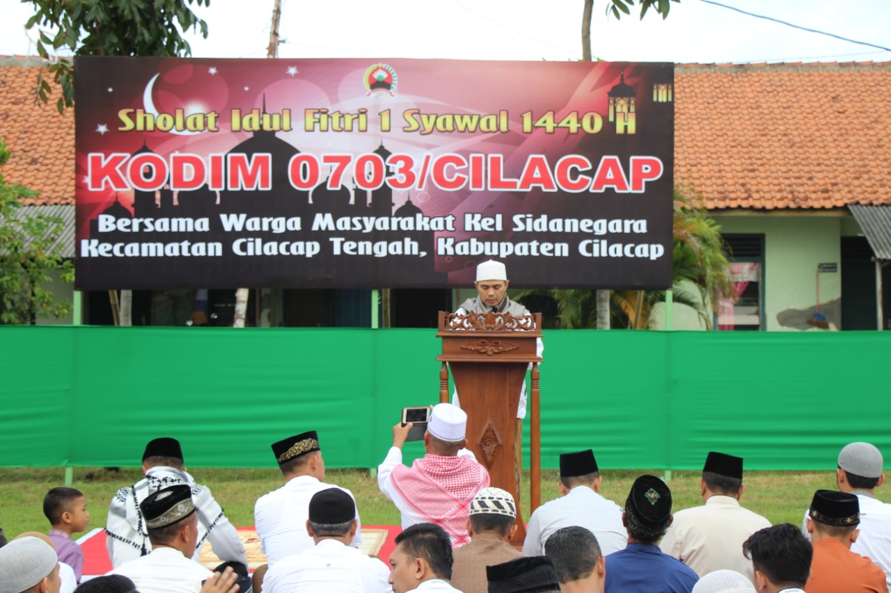 Keluarga besar Kodim bersama warga Kelurahan Sidanegara dan Sidakaya yang bersebelahan, melaksanakan salat Ied bersama di Lapangan Asrama Kodim 0703/Cilacap.