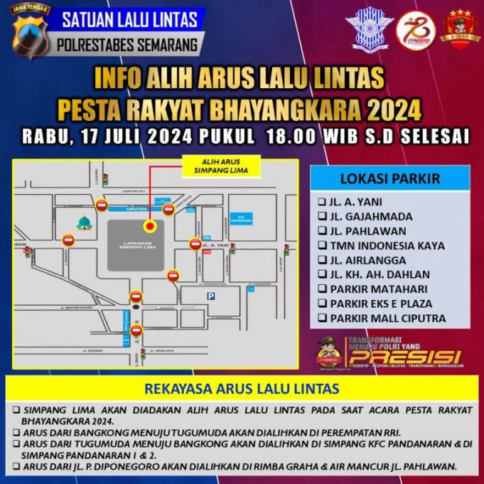 Untuk mengakomodasi kerumunan besar, arus lalu lintas dan pengaturan parkir dialihkan di daerah sekitarnya. Satlantas Polrestabes Semarang, penutupan kawasan Simpang Lima dilakukan mulai pukul 18.00 WIB hingga akhir acara namun untuk kegiatan dimuali dari 14.00 WIB. Arus lalu lintas dialihkan di beberapa persimpangan, termasuk RRI, Simpang KFC Pandanaran, dan Simpang Pandanaran 1 & 2. Lokasi parkir tersedia di berbagai tempat, antara lain Jl A Yani, Jl Gajahmada, Taman Indonesia Kaya, dan beberapa lokasi lainnya.
