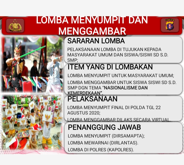 MASPOLIN || Palangka Raya (Kalimantan Tengah) — Kepolisian Daerah Kalimantan Tengah akan menyelenggarakan lomba virtual cipta karungut dengan tema kemerdekaan. Perlombaan ini dilaksanakan guna memperingati Hari Kemerdekaan RI ke-75 di tahun 2020.