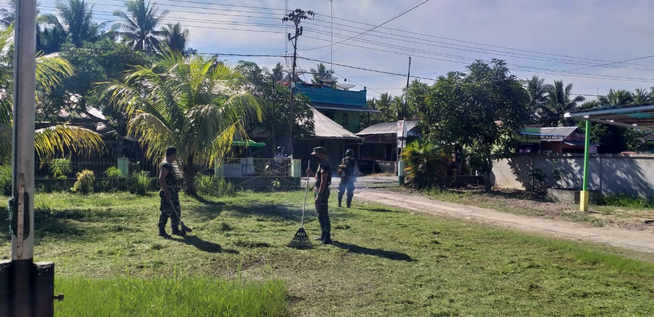 Anggota Koramil 04/Jawai Serda Yesa dan beberapa Anggota lainnya melaksanakan kegiatan dalam rangka perawatan dan pembenahan Pangkalan, yaitu pembersihan depan Koramil dengan membabat rumput menggunakan mesin.