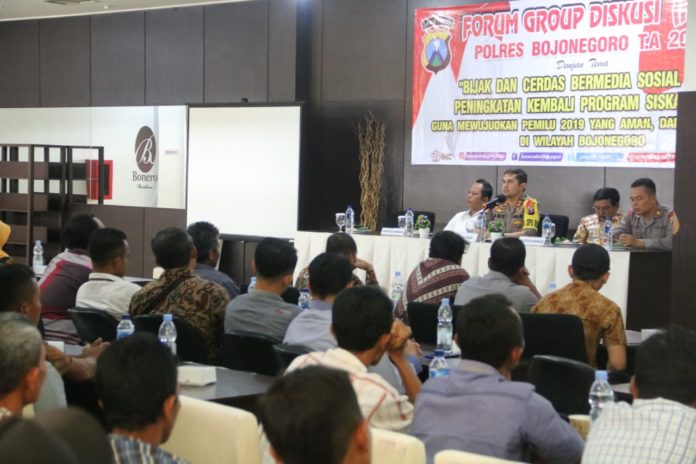 Bojonegoro,Maspolin.id – Sat Binmas Polres Bojonegoro pada hari Minggu (31/03/2019) pagi menggelar acara Forum Diskusi Grup (FDG) di Hotel Bonero dengan Tema “Bijak dan Cerdas Bermedia Sosial Serta Peningkatan Kembali Program Siskamling Guna Mewujudkan Pemilu 2019 yang Aman, Damai dan Sejuk di Wilayah Bojonegoro.